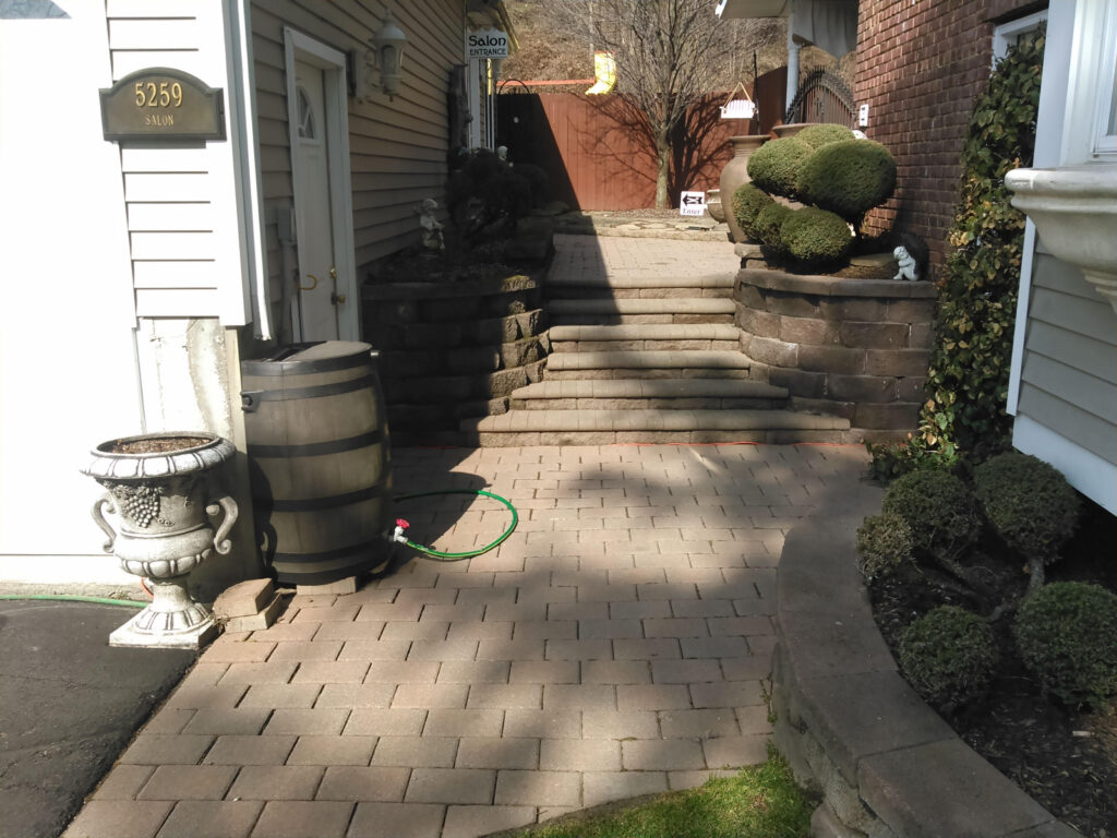 This classic installation features Cambridge paving stones paired with curved decorative block walls that elegantly encase matching block steps. Over 25 years since its completion, the craftsmanship and materials have stood the test of time, with the project still looking as stunning as the day it was installed. The combination of durable pavers and artfully designed walls creates a timeless outdoor space that showcases lasting beauty and quality.