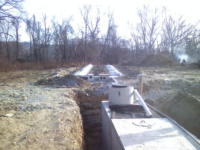 We had to break out the BIG HAMMER on this one. This is an up pump septic system, consisting of two tanks. Both tanks had to have the shale stone hammered out to create a place for them to sit. Systems last when installed properly.