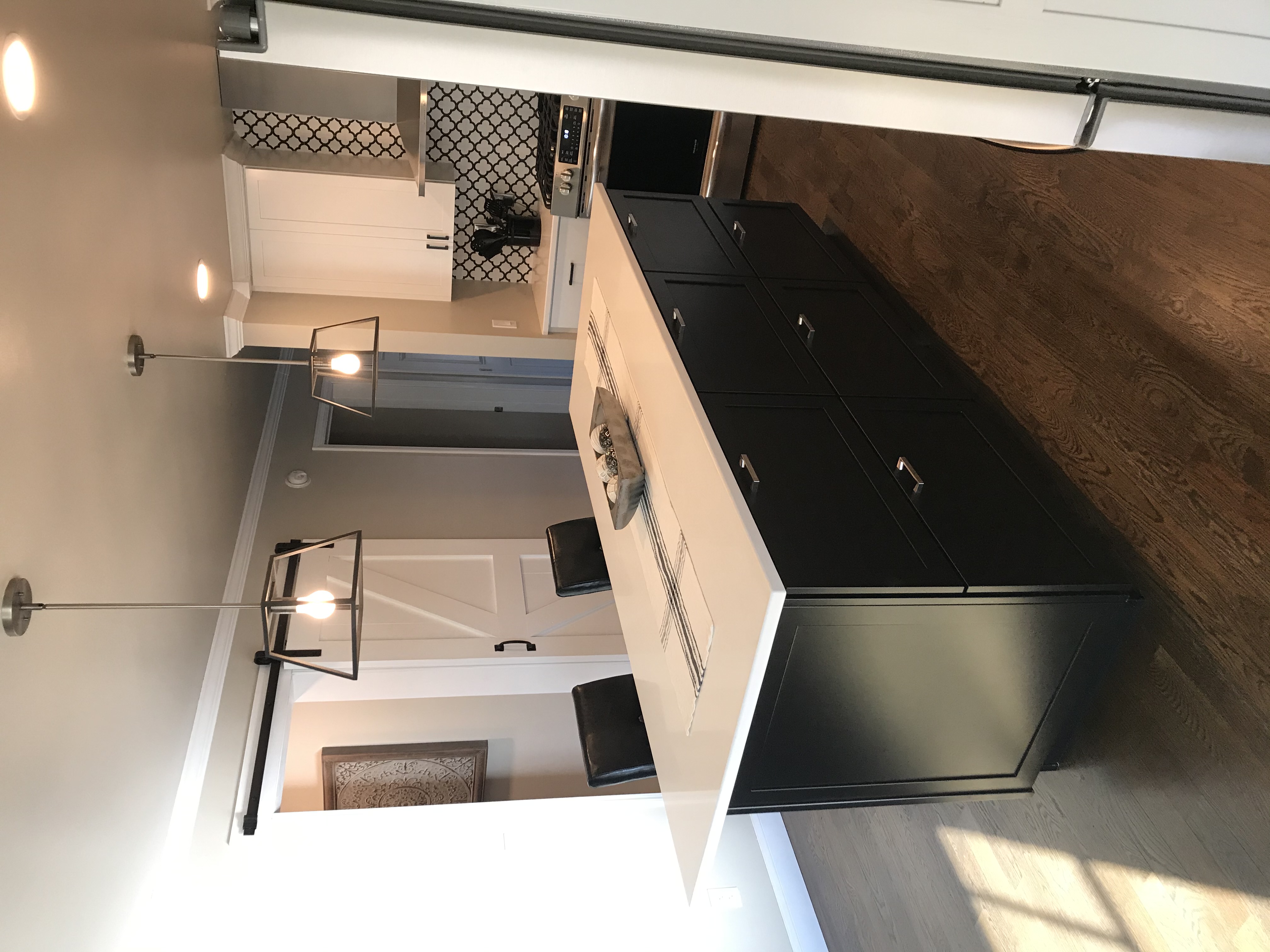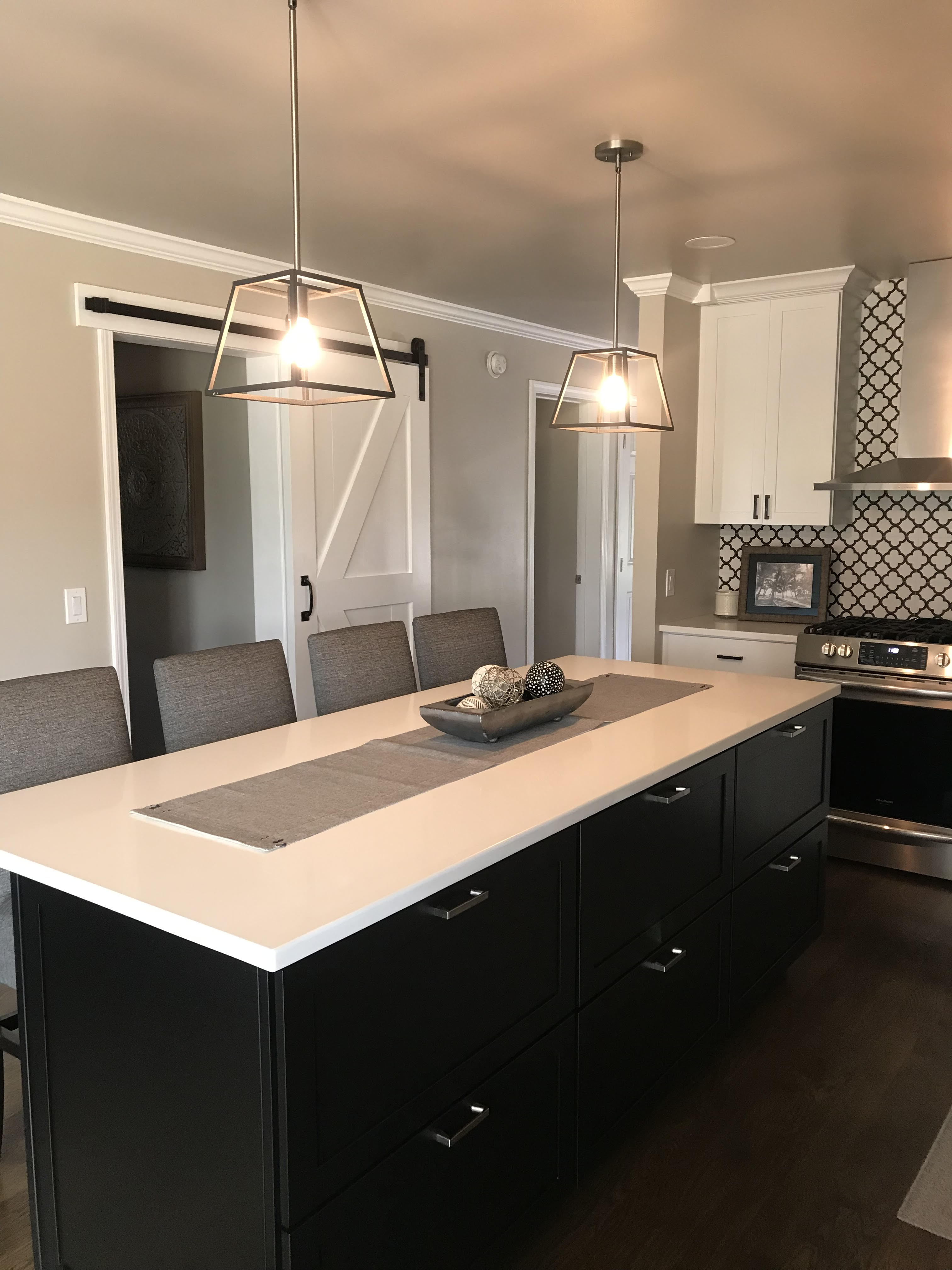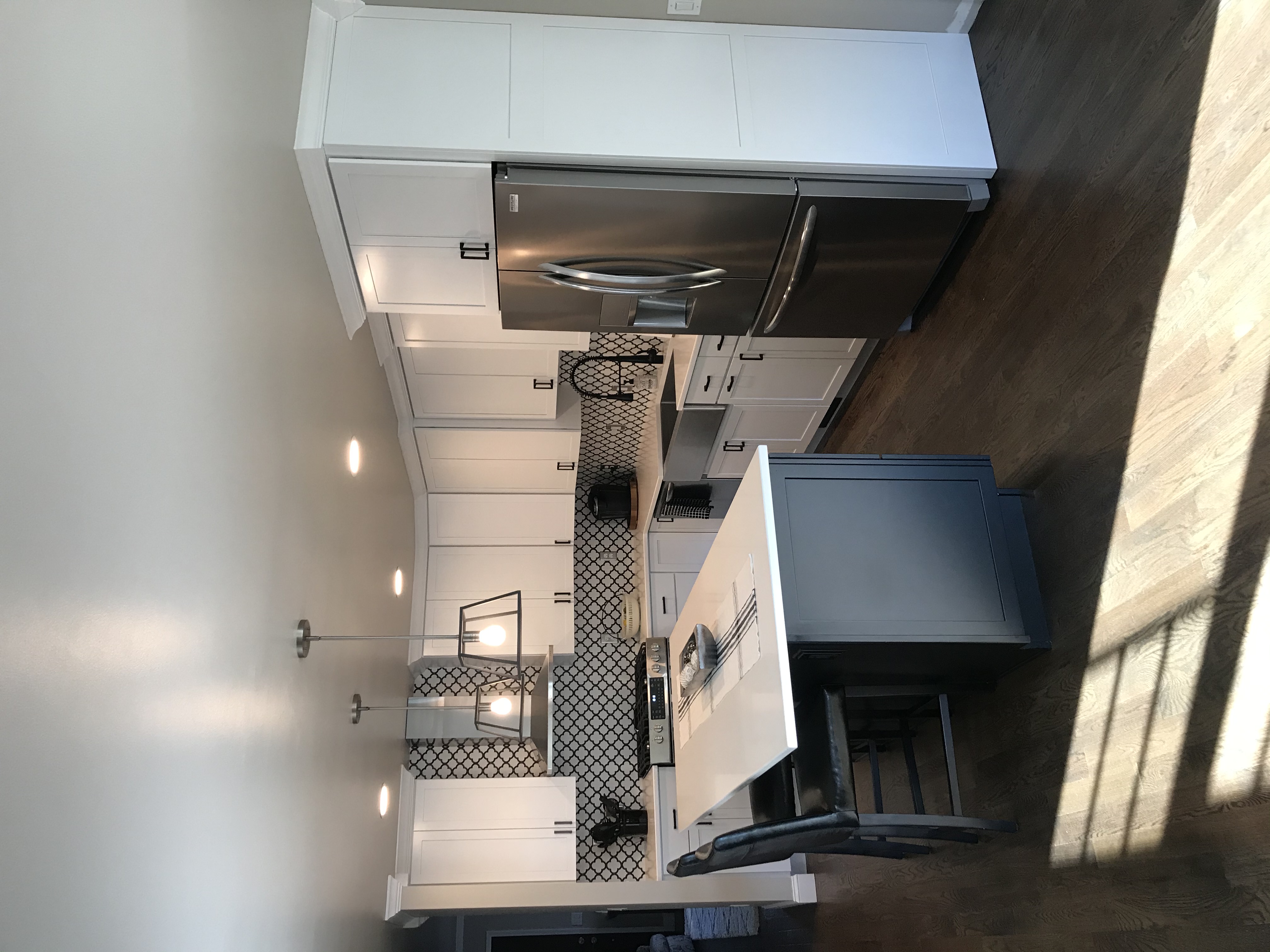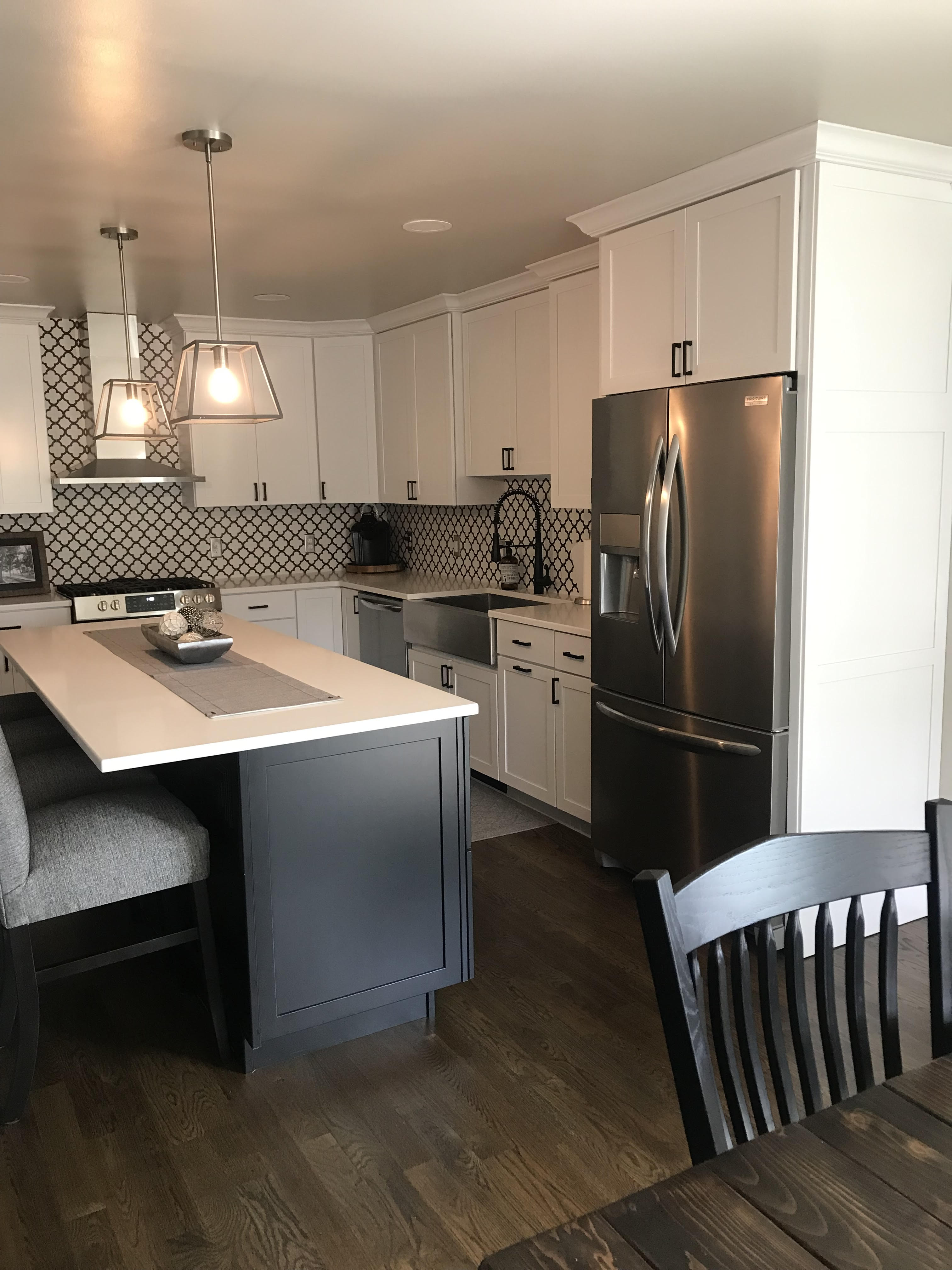 This was a total kitchen remodel. We removed the existing cabinets, reconfigured lighting, repaired damaged drywall, and then installed Kraftmaid cabinets.